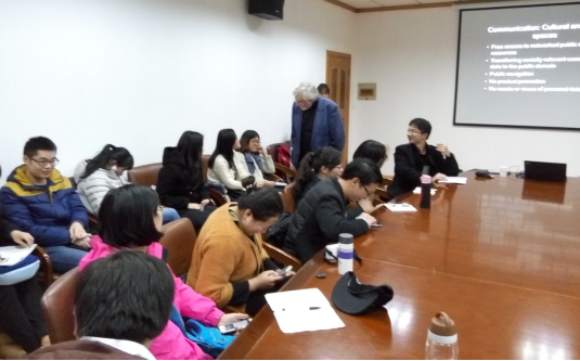 其他同学与教授交流了互联网的弊端、消费主义导致人愈发自私、广告泛滥、英国媒体情况等问题,窗外冬雨绵绵,室内掌声不断。默多克教授所讲内容涉及领域广泛,同学们获益匪浅。11月21日上午,默多克教授将参加由tyc33455cc太阳成集团主办的第八届跨文化传播国际会议(ICIC)并分享自己的研究成果与观点。