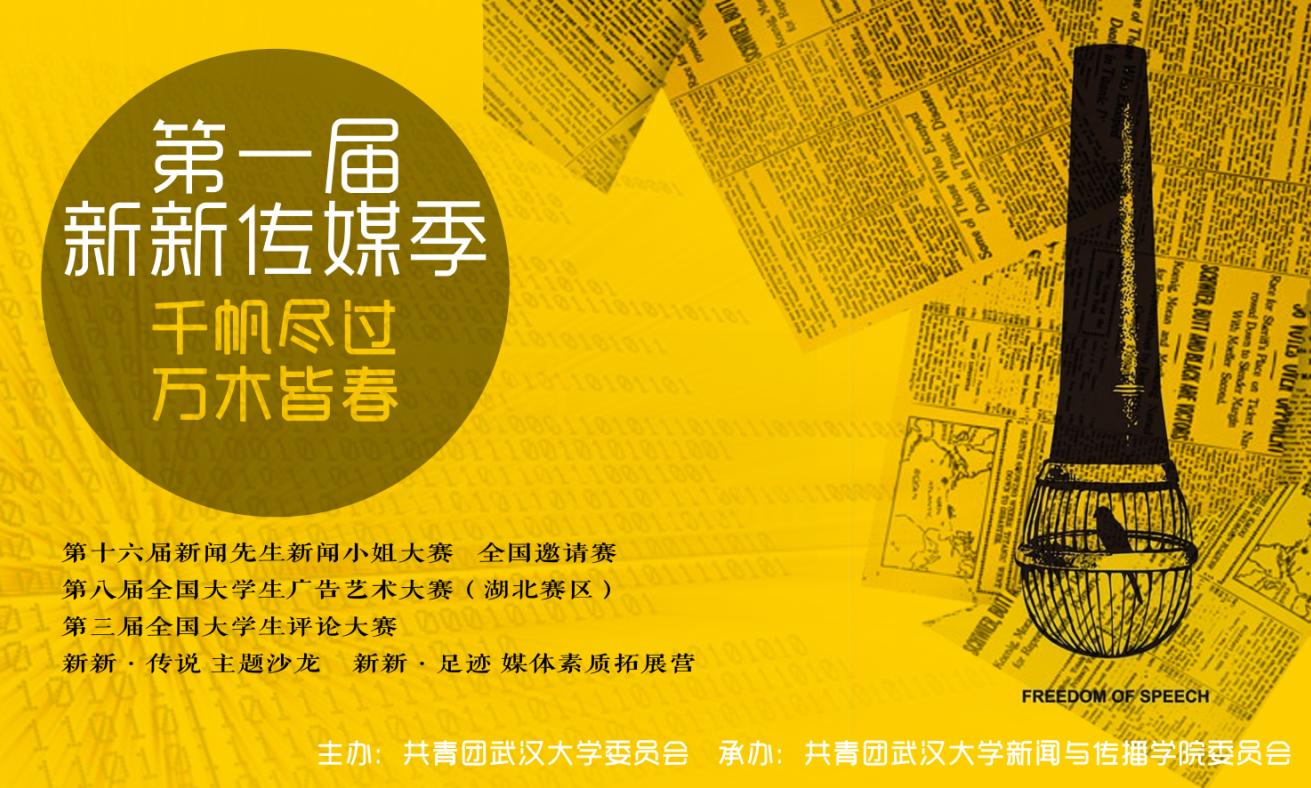 以“千帆尽过·万木皆春”为主题,第一届新新传媒季由五大赛事——第十六届新闻先生新闻小姐大赛全国邀请赛、第八届全国老员工广告艺术大赛(湖北赛区)、第三届全国老员工评论大赛、新新传说·主题沙龙和新新·足迹媒体素质拓展营共同组成。
