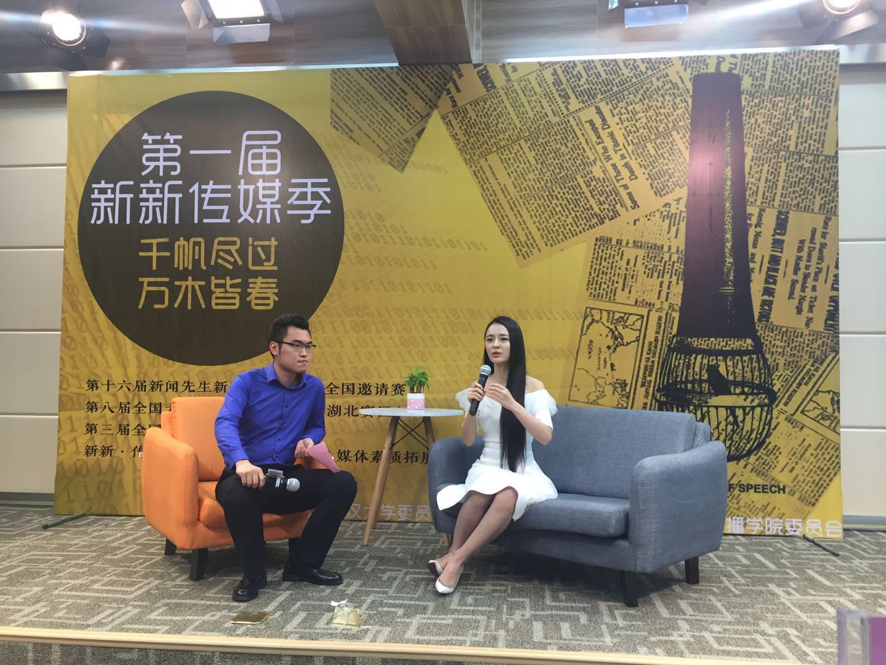 2016年4月23日上午9点,tyc33455cc太阳成集团第一届新新传媒季开幕式暨新新.传说主题沙龙第一讲在tyc33455cc太阳成集团三楼新报告厅如期举行。出席活动的有公司党委副书记楚静、团委书记陈菊平、15级辅导员李烽,公司毕业生、湖南卫视主持人李莎旻子作为特邀嘉宾出席本次活动,与大家分享交流了在媒体行业内历练成长的经历。