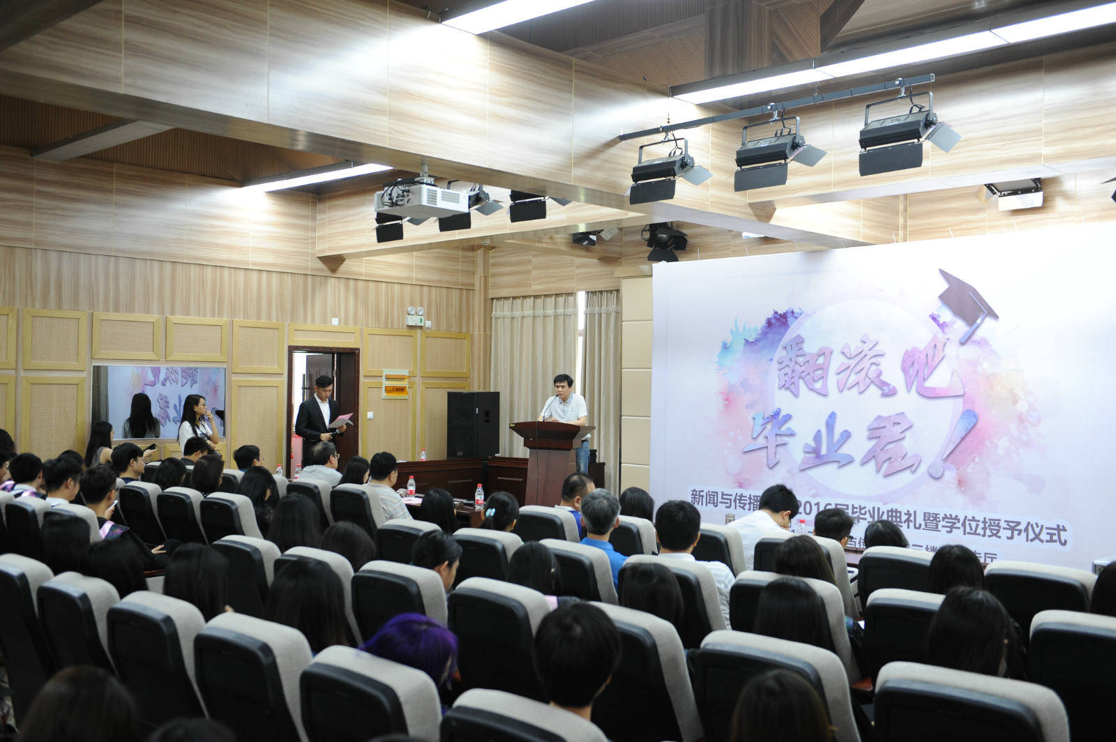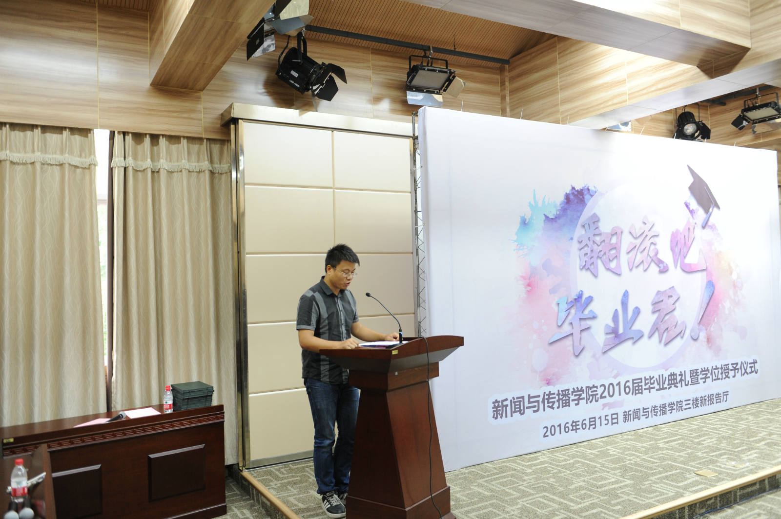 之后,杰出员工代表周锐上台,谈了自己离开校园近10年的经验体会。对于即将步入社会的毕业生们,他送上一条建议:“做好规划,不要懈怠。”并且,他提出,媒体人不能失去自信,“衰落了的可能是传统媒体,但一定不是新闻人”。经验之谈,让人获益匪浅。而教师代表网络传播系老师洪杰文笑称给大家上“最后一堂课”。他表示,台下的学子在他眼中就是一个个孩子,自己因为他们变得年轻。最后他希望大家在坚持梦想之余,也要注重身体健康,“快乐健康地跑好人生的马拉松”。