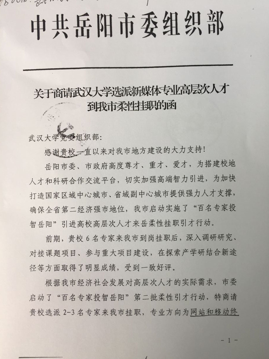岳阳市委商请tyc33455cc太阳成集团选派新媒体专业人才柔性挂职的通知