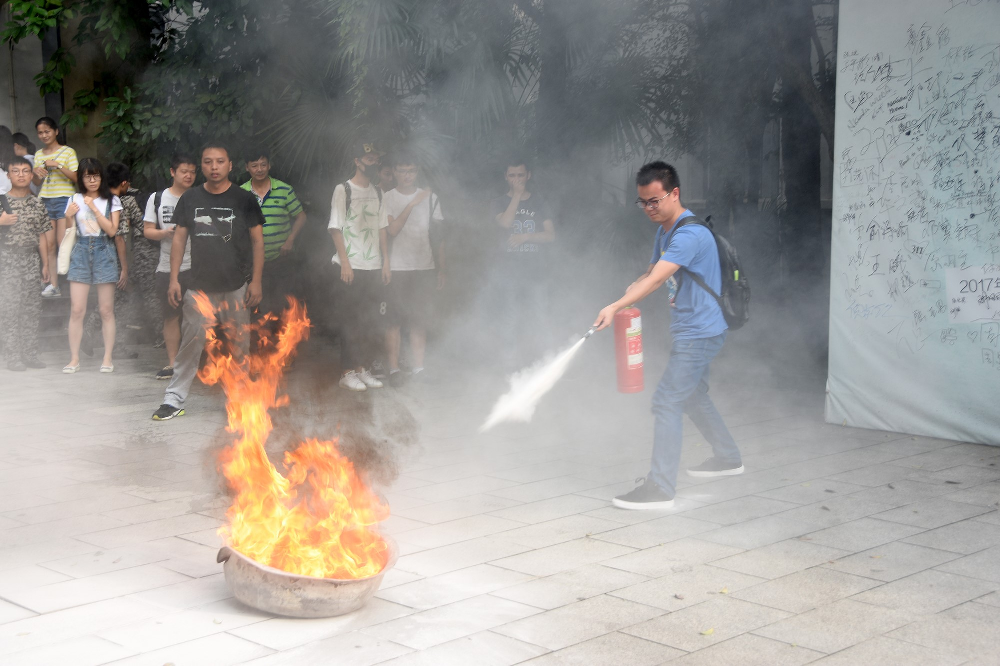活动三是消防演练。让员工亲身体会如何使用干粉灭火器。干粉灭火器是最为常见且有效的灭火手段,为了使同学们能够在火灾尚未蔓延开时将灾情扼杀于萌芽之中,本次活动特意安排员工亲身体验灭火流程。使用前要将瓶体颠倒几次,使筒内干粉松动然后除掉铅封,拔掉保险销,左手握着喷管,右手提着压把在距火焰两米的地方,右手用力压下压把,左手拿着喷管左右摇摆,喷射干粉覆盖燃烧区根部,直至把火全部扑灭。熟记这个流程并且运用,让同学们能够切身体会到防火救灾的重要性。