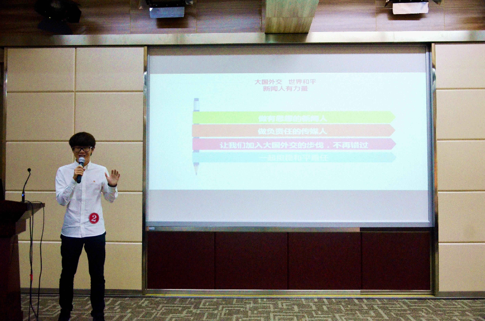 谭翊晨进行了以《那些年,和我擦肩而过的大国外交》为题的演讲。首先他介绍,自己和奥朗德等他国领导人的多次擦肩而过的遗憾激励他参加了模拟联合国。而正是在模拟联合国的经历,使他了解到了中国在外交上做出的重大贡献,并让他意识到,不是我们错过了外交事件,而是它们一直在我们身边,只是我们未察觉到而已。最后,他向我们展示了习近平总书记的出访足迹,并认为我们作为新闻人,有责任也有义务参与到中国外交中来。评委马宪丰在点评中,认为他的演讲有趣,有故事,也有思想。