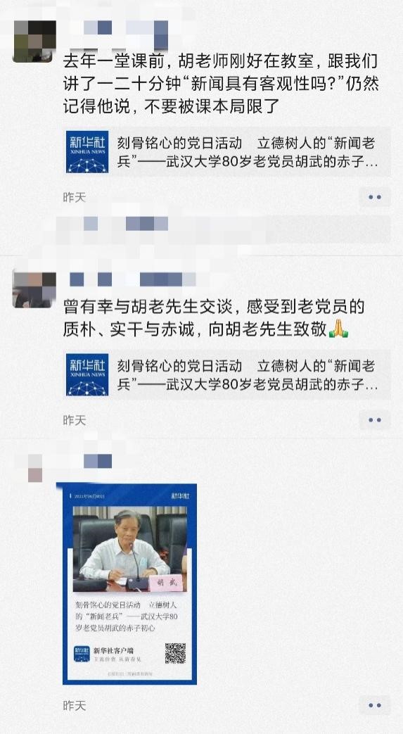 相关报道同样在朋友圈刷屏,大家纷纷转发评论,胡武老师潜心立德树人、多年默默坚守的精神让大家感到由衷的敬佩,也引起了广大师生的共鸣。“我是武大人,我向胡武前辈学习”“致敬胡老师,一切保重”“希望胡老师节哀顺变,“新闻老兵”再出发”,网友提到最多的,还是对胡武老师的尊敬与感动。