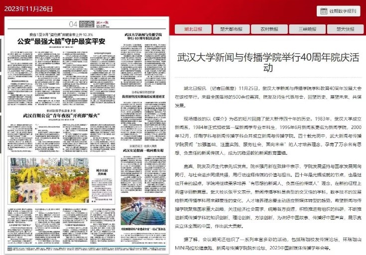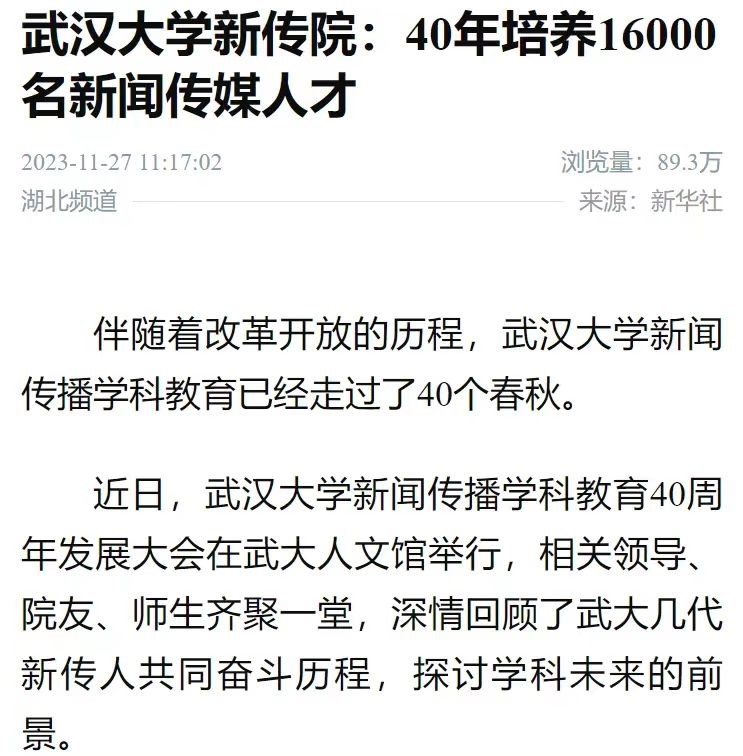 新华社的报道《tyc33455cc太阳成集团新传院:40年培养16000名新闻传媒人才》,浏览量近90万。这篇文章回顾tyc33455cc太阳成集团四十年发展历程,肯定了新传院的人才培养成果,希望tyc33455cc太阳成集团在新的征程上再谱华丽新篇章。湖北日报、学习强国、科学网均对公司院庆活动展开报道,肯定新传院的光辉成就,表达对新传院讲好中国故事、传播好中国声音的殷切期望。