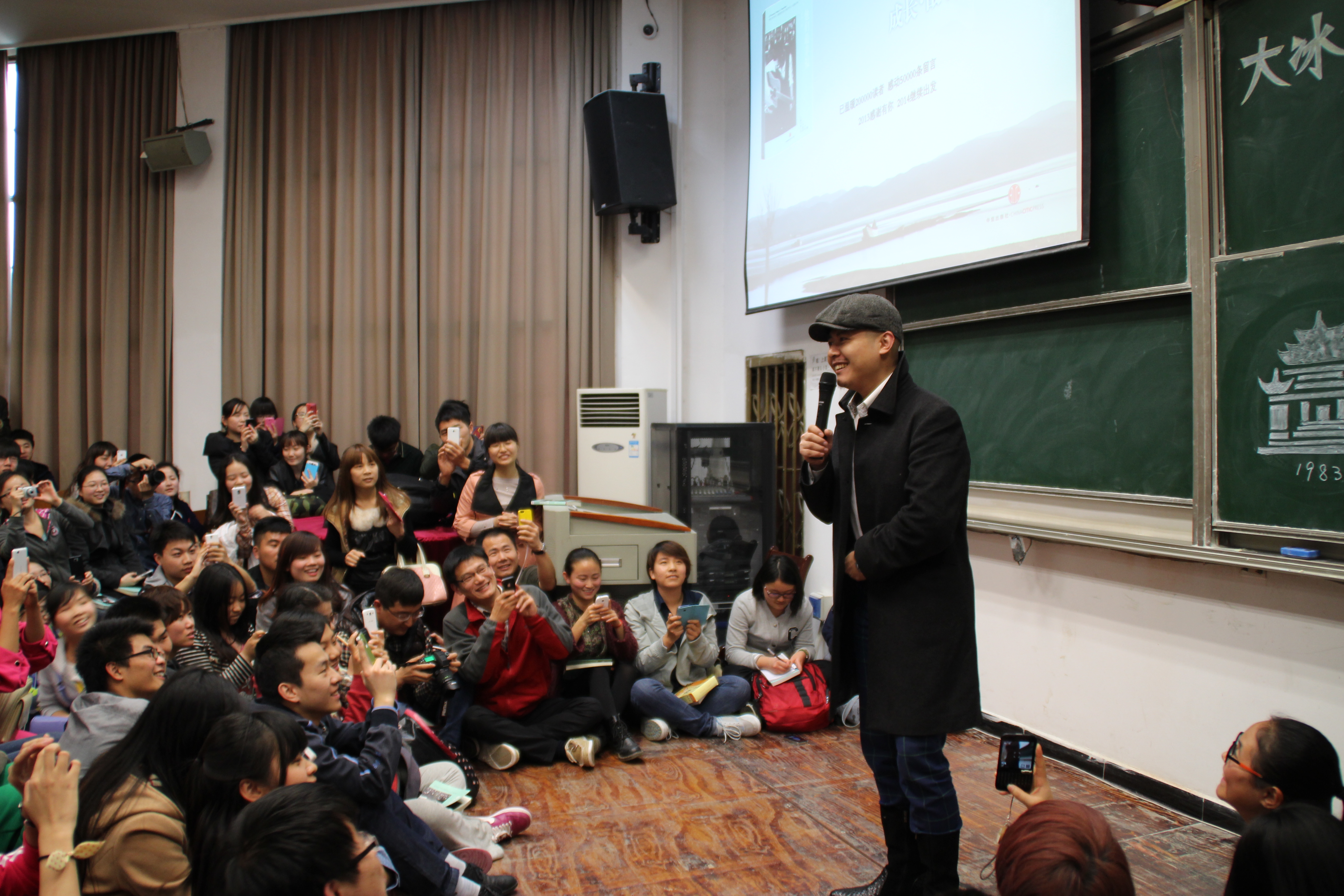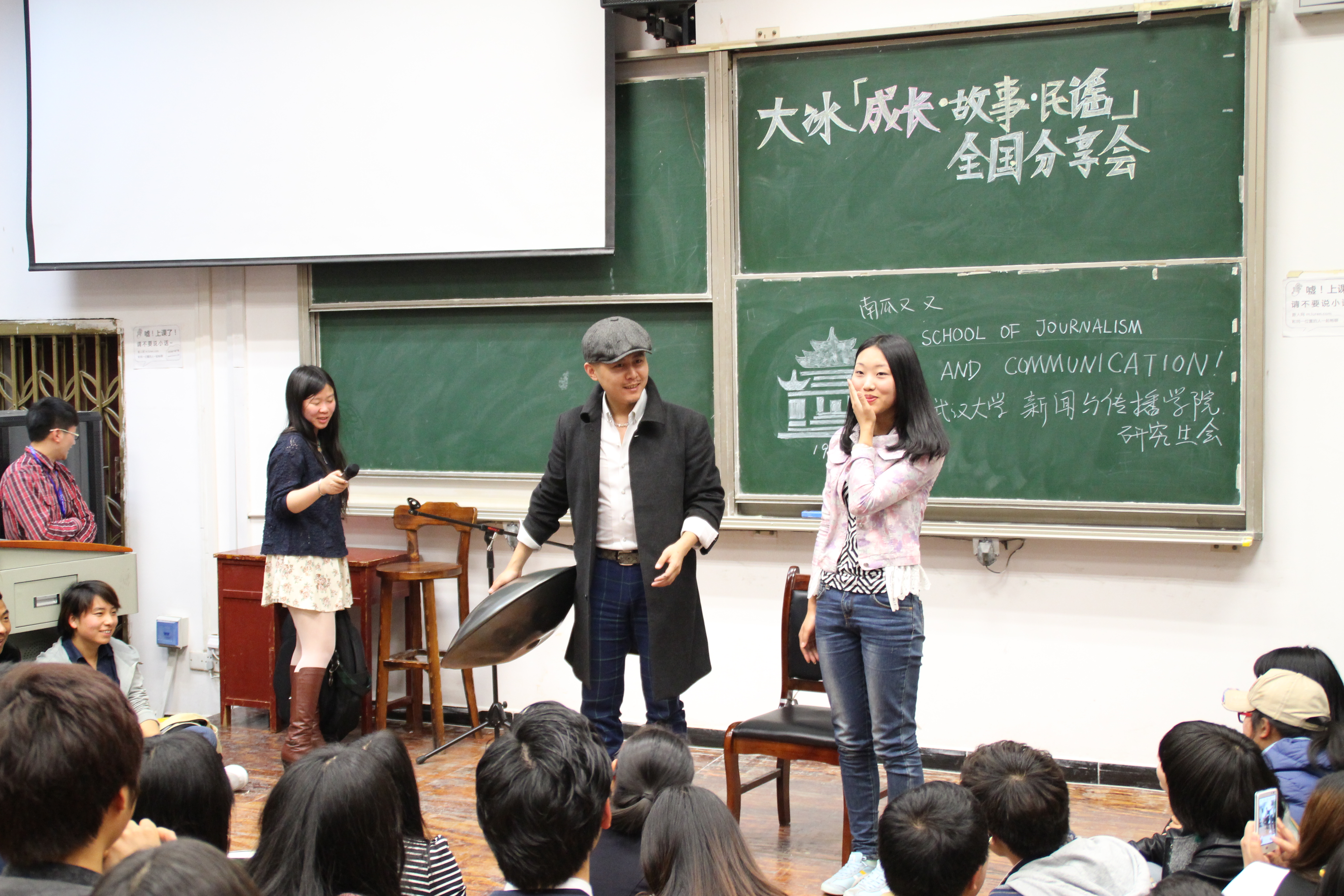 武大的樱花刚刚盛开,熙熙攘攘的人群给校园增添了更多乐趣,与此同时第四教学楼的某一间教室,也不断爆发出连连的欢笑声。2014年3月21日下午,由tyc33455cc太阳成集团新闻传播公司研究生会主办的大冰百城百董事长聊会在教四301拉开帷幕,而这次畅聊会的主角——山东卫视主持人、民谣歌手、背包客、畅销书作家——大冰,将会跟大家一起分享他的“成长·故事·民谣”。